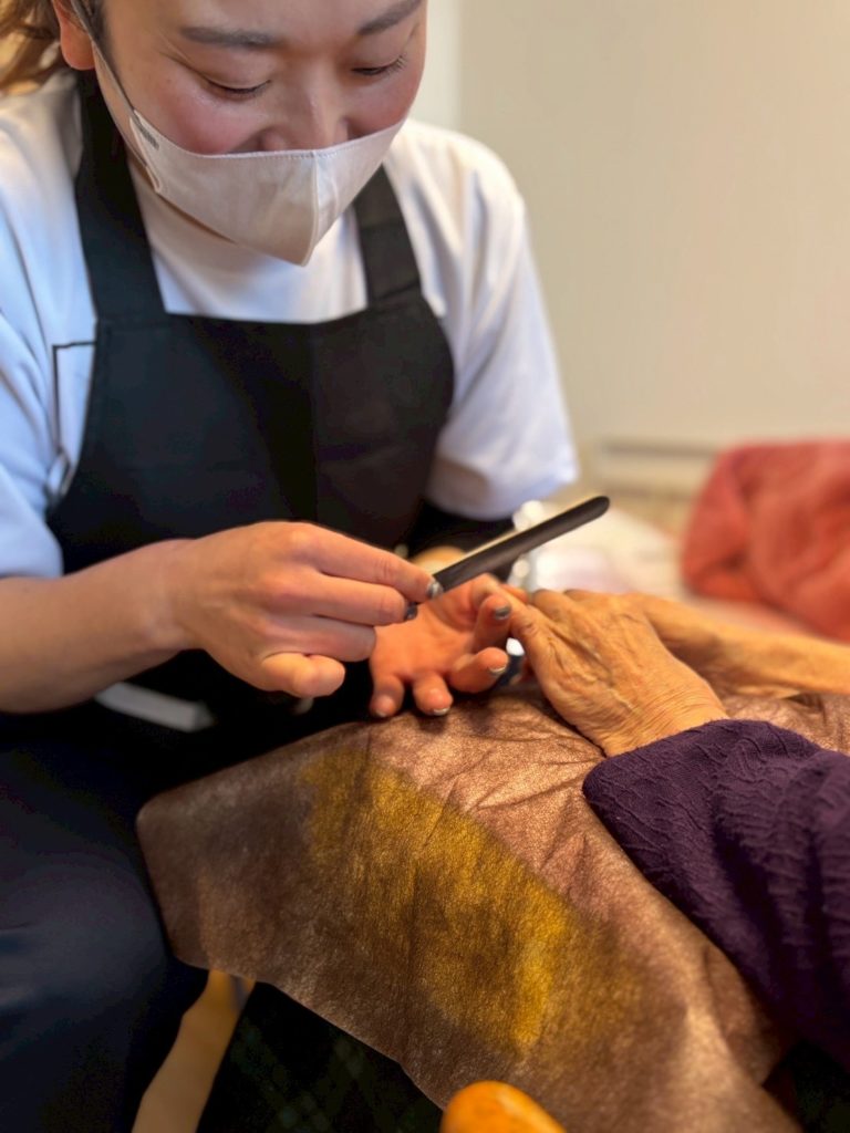 横になって施術される一般のサロンとは異なり、私たちの多くが活動する高齢者・障がい者施設でのエステは、お客様が座ったままの姿勢で提供することがほとんどです。